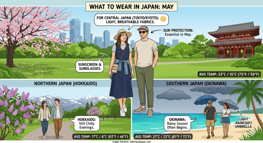 | Kanto/Kansai | Tokyo/Kyoto | 23°C | 15°C | Warm and sunny. Early summer vibes. |