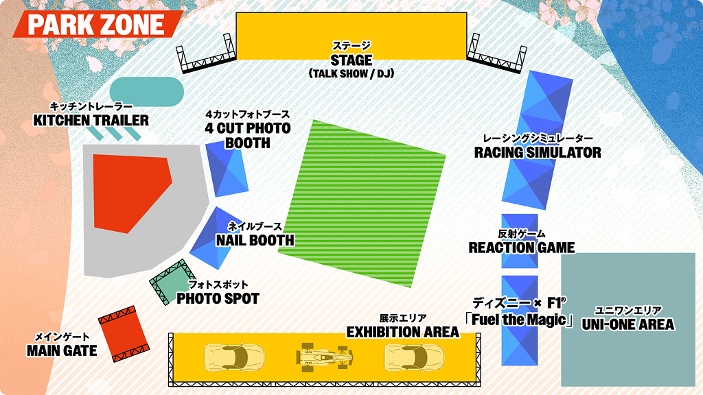 - PARK ZONE (Tokyo Tower): Centered around the main stage, this area features all-black container structures inspired by the F1 paddock atmosphere. Enjoy the Honda booth display, simulators, and interactive challenge games.